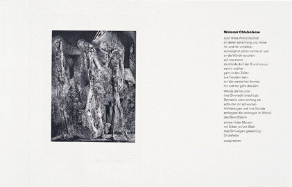 Home Bibliophile Editionen 24x34. Blätter zu Literatur und Grafik Walther Petri: Welemir Chlebnikow. Stumm und Stampfend. 2 Gedichte Rolf Münzner: Schablithographie, 1985 340 x 720 mm zweifach gefaltetes Bl. Gesamtgestaltung: Rolf Münzer Handsatz und Druck: Werkstätten der Hochschule für Grafik und Buchkunst Leipzig Druck der Lithograpfhie: Horst Arloth ←Sonette. Drei Bände: Petrarca, Shakespeare, Rilke Adel Karasholi: Der Weinberg Erde→
